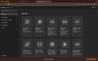 The interface is clean and modern, providing quick access to all tools from a sidebar menu. Users can format JSON, generate hashes, encode and decode data, and even compare text with a diff tool. With features like syntax validation and error detection, DevToys New Tab is an invaluable resource for developers, ensuring that essential tasks can be completed swiftly and efficiently.